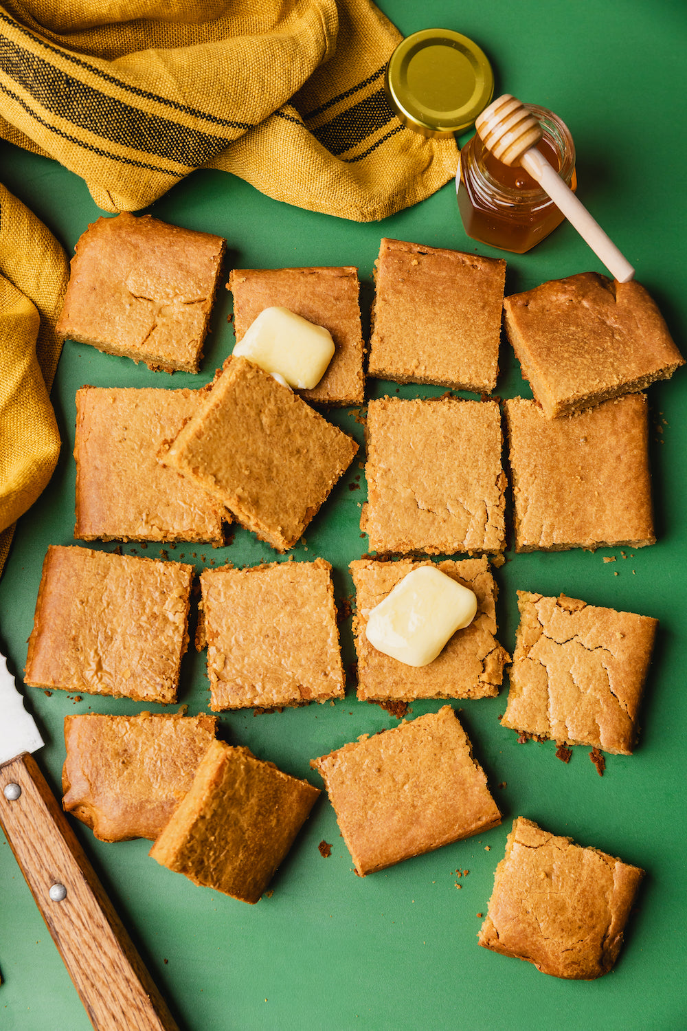 Servir en carrés tièdes, avec un morceau de beurre qui va fondre au contact du corn bread, et un filet de miel.